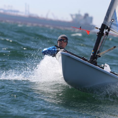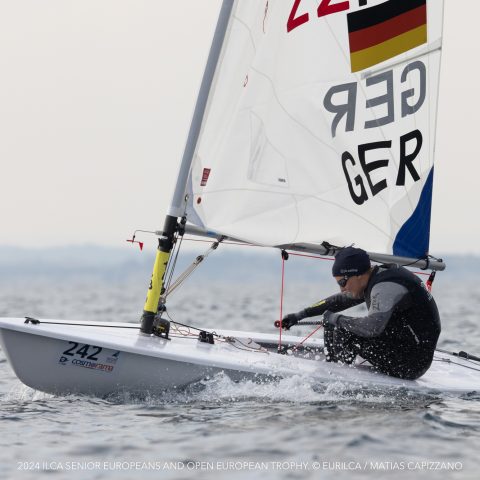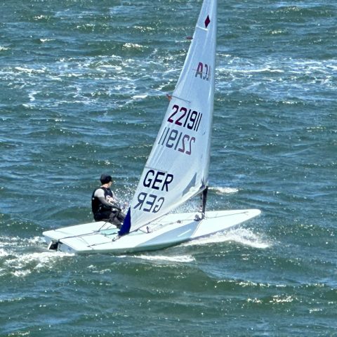 Am fünften Tag brauchte ich zu lange, um hinter die Bedingungen zu kommen. Im ersten Tagesrennen habe ich den Anschluss an die Spitzengruppe bei der Ansteuerung der Luvtonne liegen gelassen. Im zweiten Rennen hatte ich einen sehr guten Start und habe danach die Dreher ausgesegelt, bei einer konstanten Rechtsdrehung war damit aber nicht viel zu holen. Die ersten beiden Rennen waren also nur besseres Mittelfeld. Im letzten Rennen des Tages war mein Start nicht so gut, diesmal habe ich aber die klar bessere rechte Seite gut ausgesegelt und konnte das Rennen hinter der späteren Weltmeisterin aus Frankreich klar auf Platz 2 beenden. Nach einem soliden ersten Segeltag lag ich mit meinen Ergebnissen unter den ersten 15.